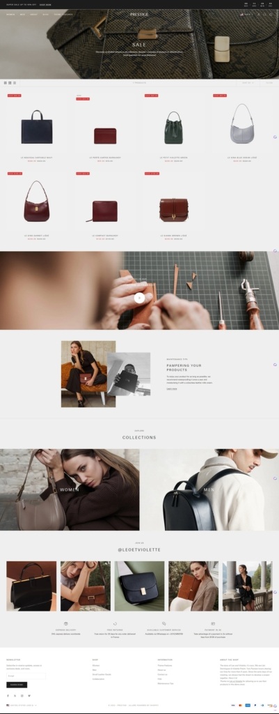 The Prestige Shopify theme is designed for premium, high-end brand appeal, and currently comes with three styles: Coutoure, Vogue and Allure.