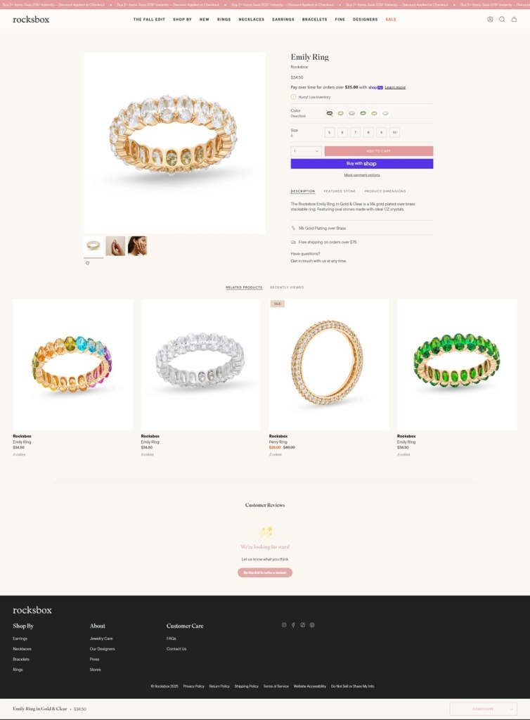 Rocksbox’s site is stylish and polished, with a clean layout, clear category navigation, and featured visuals that spotlight pieces in real contexts. Their product range is curated jewelry — rings, necklaces, earrings, bracelets — often from designer and conscious-material lines. The site blends commerce with brand story: emphasizing craftsmanship, designer collaborations, and sustainability alongside ease of shopping.