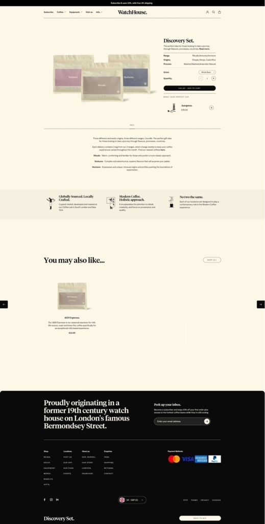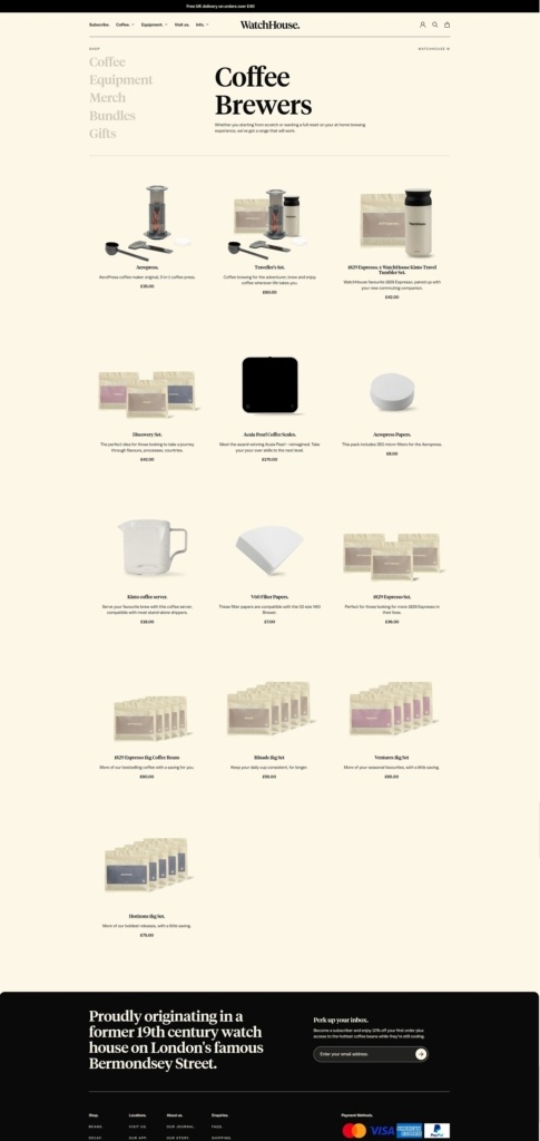 WatchHouse presents a premium coffee experience through a beautifully designed website with elegant typography, subtle animations, and high-res visuals. Products include specialty coffee beans, brewing gear, subscriptions, and branded merchandise. The site is easy to navigate with clean layouts, intuitive filters, and strong storytelling. It mirrors the brand’s modern café aesthetic with a refined, immersive digital feel.