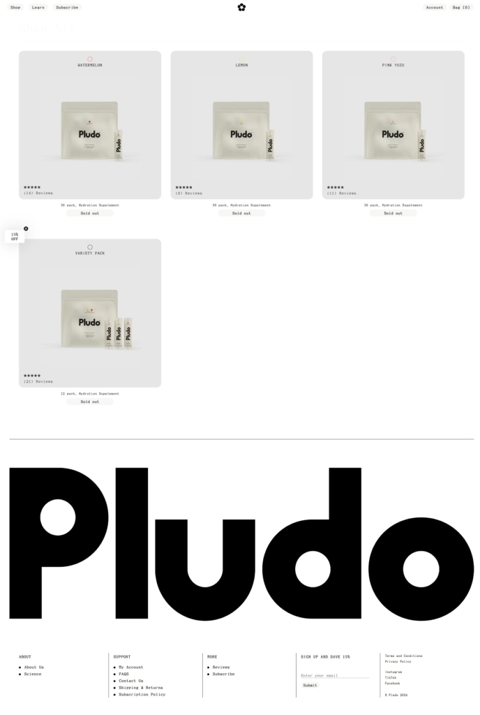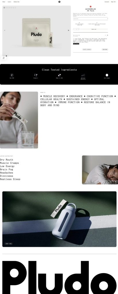 Pludo Labs offers premium electrolyte hydration supplements in single-serve flavours like Lemon, Watermelon and Pink Yuzu, formulated with electrolytes, trace minerals and amino acids to support hydration, recovery and energy. The website uses a clean, modern e-commerce layout with clear navigation, bold product visuals, and benefit-focused copy that highlights ingredients and functional effects. Overall, the design is straightforward and product-centric, making it easy to browse flavours, understand benefits, and purchase.