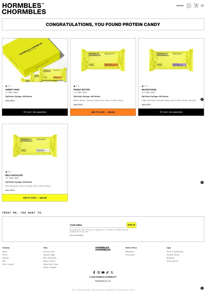 Hormbles sells “Chormbles” protein candy bars—chocolate-style bars positioned as candy with added protein and zero sugar, available in flavours like Salted Fudge, Milk Chocolate, Peanut Butter, and Cookies & Creme. The website uses a clean, modern e-commerce layout with bold product imagery, playful copy, and simple pathways to shop single flavours, build bundles, or subscribe.