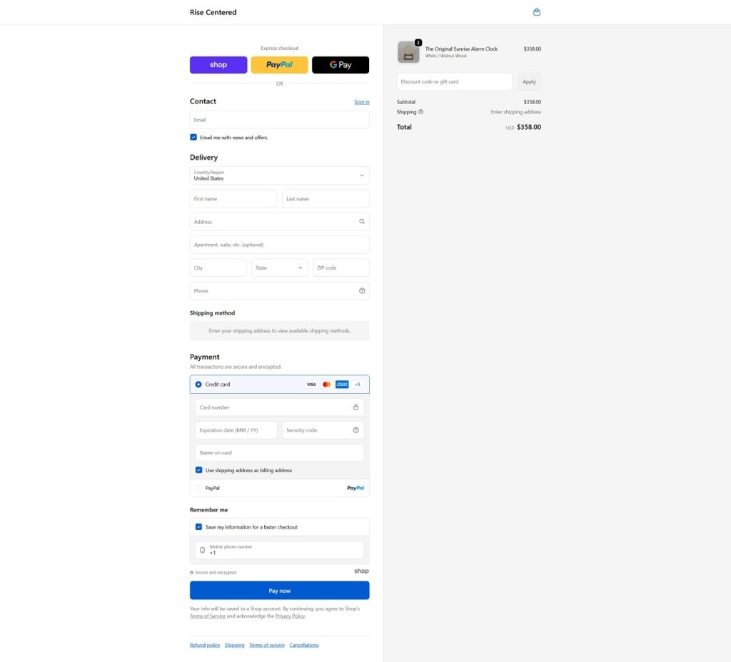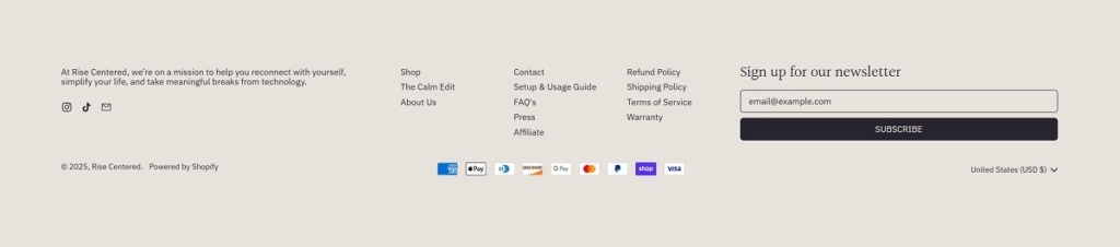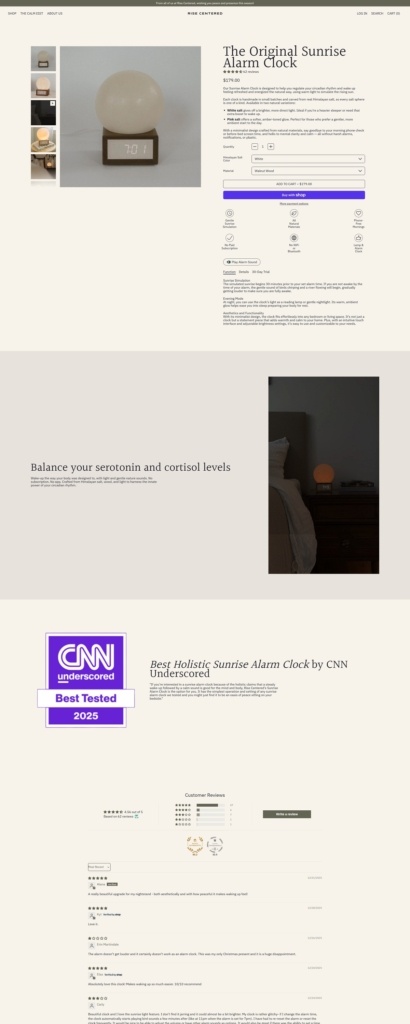 Rise Centered sells a sunrise simulation alarm clock crafted from natural materials like Himalayan salt and wood, designed to help users wake gently with gradually increasing light rather than loud sounds. Their website features a clean, wellness-oriented design with simple navigation, strong product visuals, and clear messaging about how the clock works and its benefits for sleep and morning routines. Overall, the layout is straightforward and functional, making product features and purchase options easy to explore.