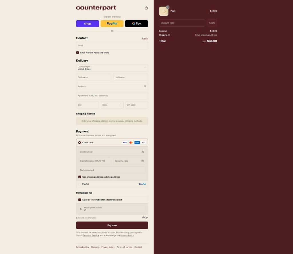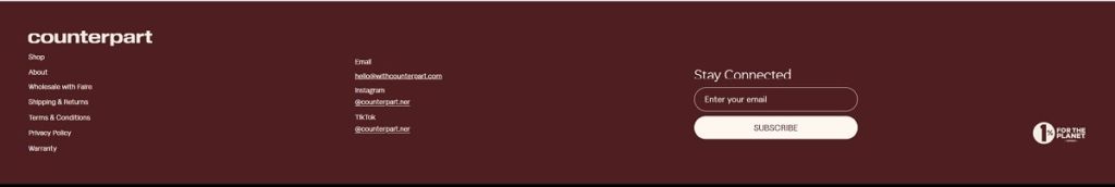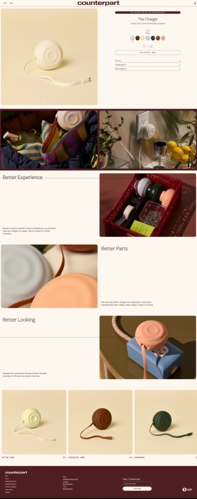 WithCounterpart sells a curated range of premium USB-C chargers and cables designed to be compact, durable and more sustainable than legacy charging gear. The website uses a clean, direct e-commerce design with simple navigation, clear product categories, bold visuals, and benefit-focused copy that highlights performance and environmental impact. The overall layout makes it easy to browse, compare and purchase tech accessories with minimal friction.