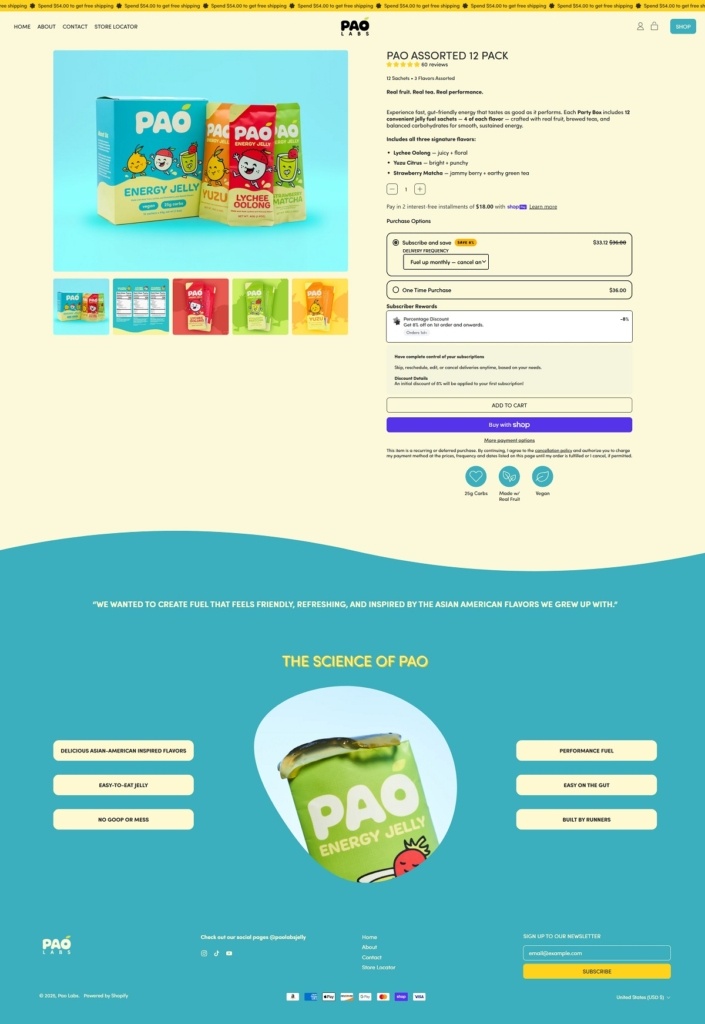 Pao Labs sells energy fuel jellies — chewable, jelly-textured endurance fuel sachets with real fruit and brewed tea flavours like yuzu citrus, lychee oolong and strawberry matcha, designed for runners and endurance athletes. Their website uses a clean, modern e-commerce layout with clear product categories, large product photography and benefit-focused messaging that explains texture, ingredients and performance-oriented use. The overall design emphasises simplicity and readability, making it easy to browse flavours, learn about nutritional features and make purchases.