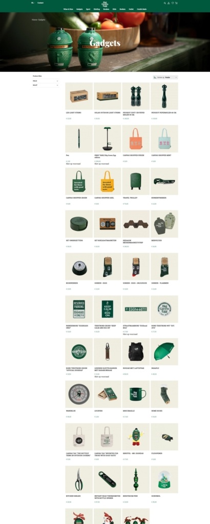 Big Green Egg’s fan-shop site leans into clean, e-commerce usability: strong navigation (by categories like Wine & Dine, Gadgets, Clothing, Kitchen, Sport) and prominent visuals of branded items. The product range is mostly branded merchandise and lifestyle accessories — think apparel, gadgets, kitchen tools, home goods — all carrying the Big Green Egg identity.