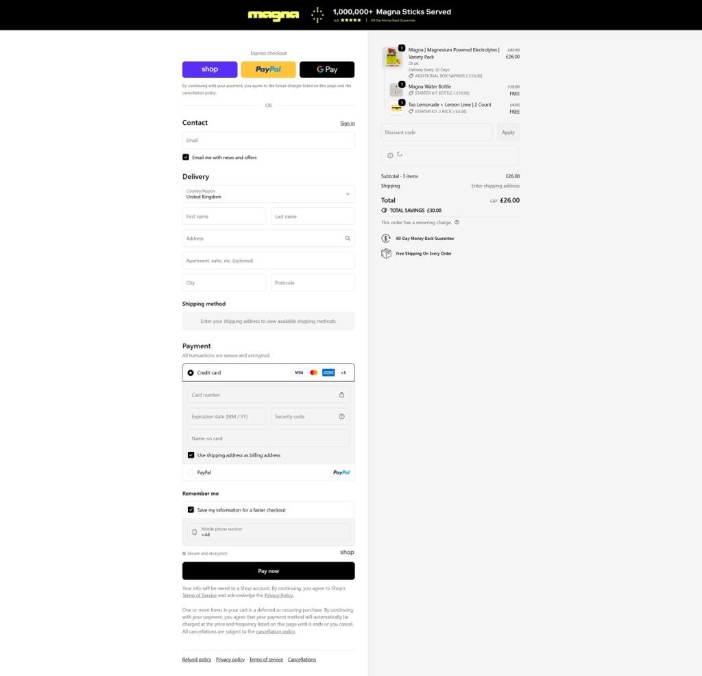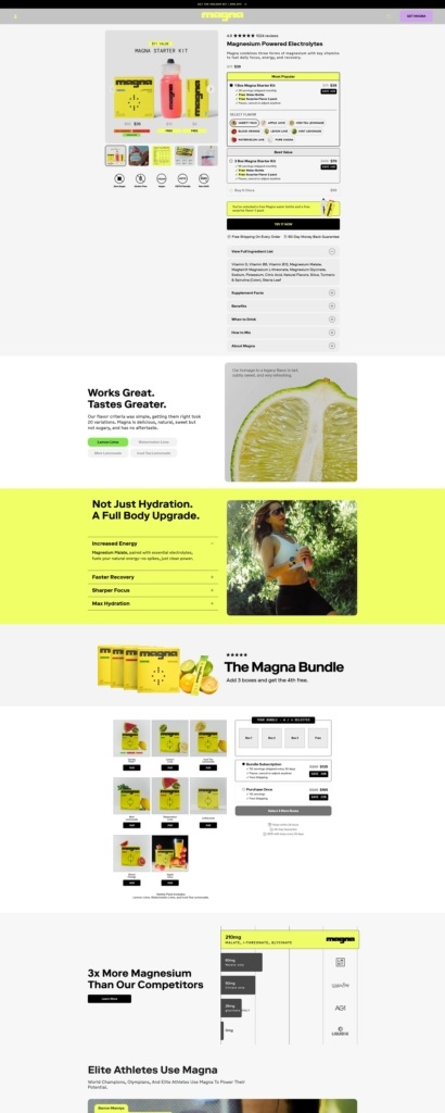Drink Magna offers magnesium-powered electrolyte hydration powders formulated to support focus, energy, recovery and efficient hydration, with multiple flavour options and starter kits available. The website uses a clean, direct e-commerce layout with clear category sections, bold product visuals, and benefit-driven messaging highlighting ingredients and functional effects.