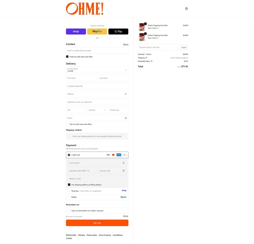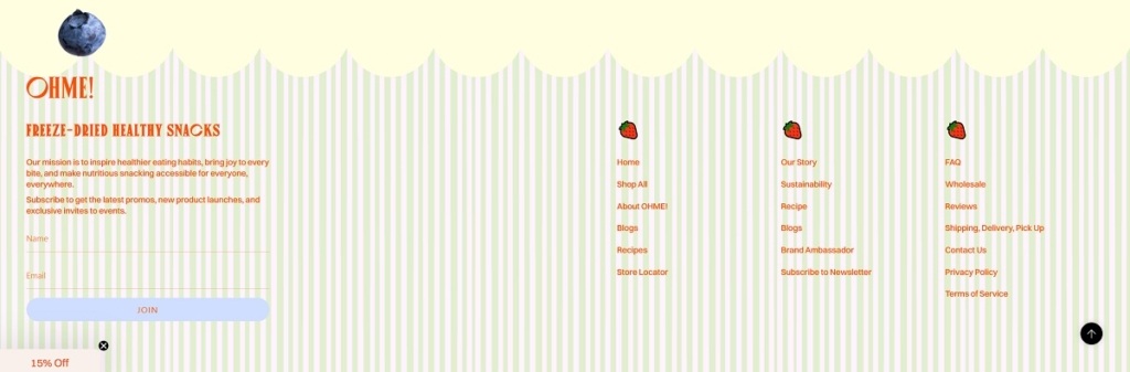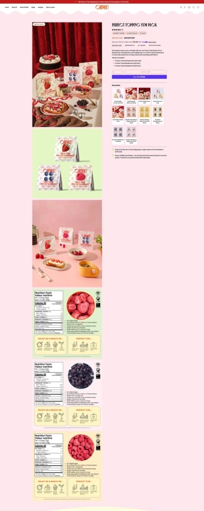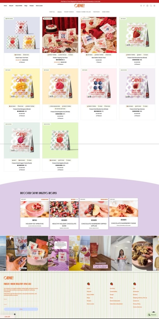 OHME! Foods offers a variety of freeze-dried healthy snacks, including fruit snacks and yogurt crunches made from real ingredients with no added sugars or preservatives. The website uses a bright, clean e-commerce layout with clear navigation, bold product imagery, and straightforward category sections that make browsing and shopping easy.