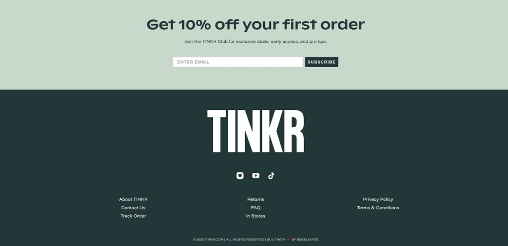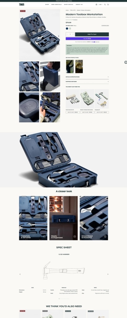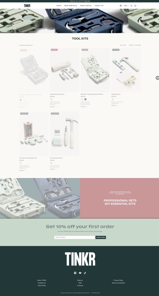 The website for TINKR unfolds with a clean, gallery-style layout featuring large photographs of kit sets, modern typography, and a muted palette that keeps the focus on tools. Their product line delivers design-forward tool kits and accessories—adjustable wrenches, hammers, screwdrivers, project kits—crafted to marry aesthetics with utility, making DIY feel stylish and accessible.