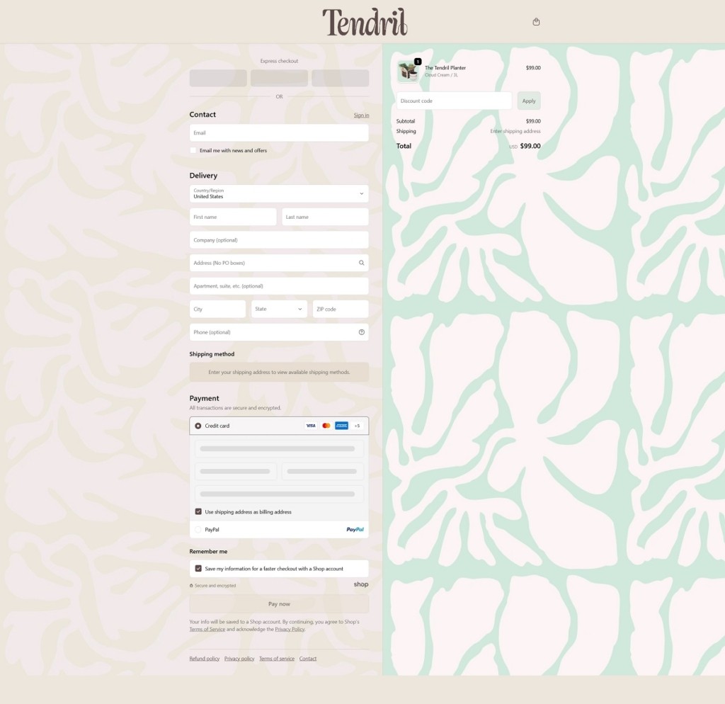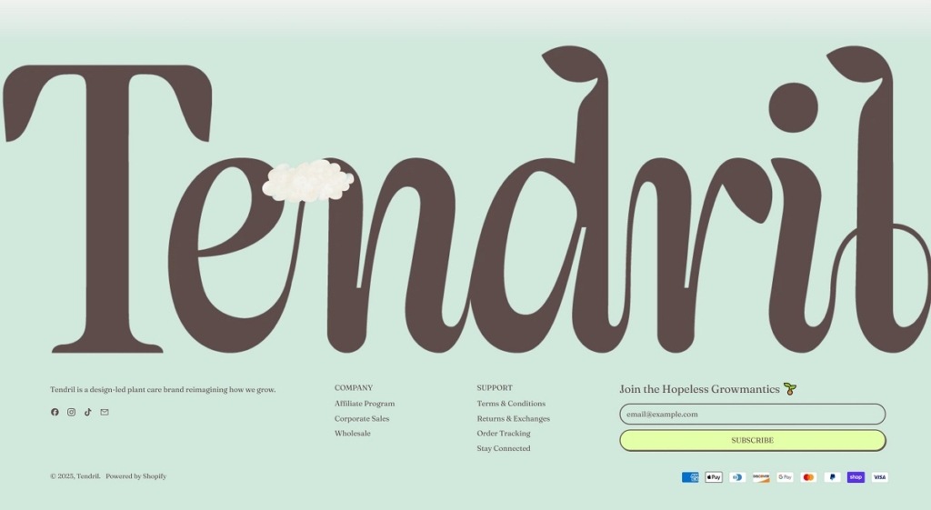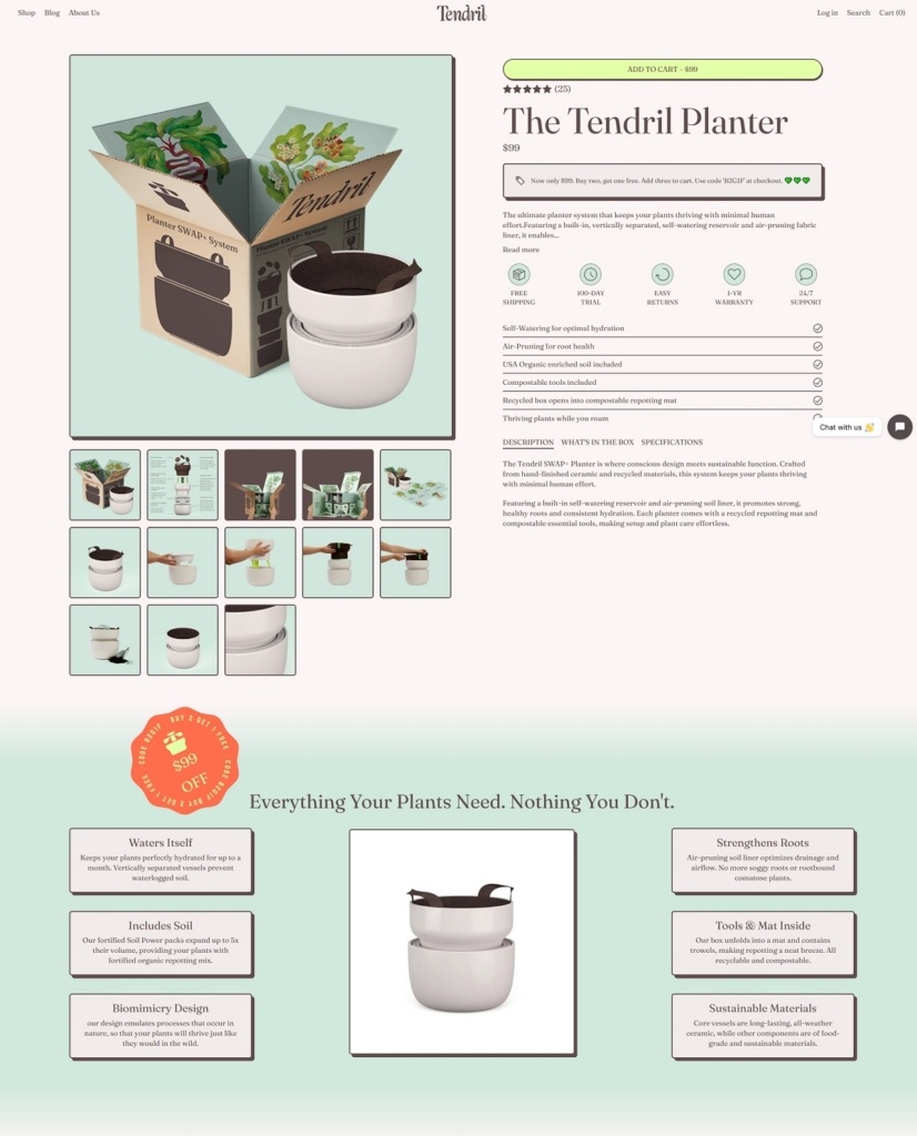 Tendril crafts design-led, self-watering planters that combine thoughtful engineering (self-watering reservoir, air-pruning liner) with premium materials and sustainability. The website design is modern, clean and lifestyle-oriented—bold hero visuals, generous white space, clear benefit-driven messaging, and an intuitive shop layout that puts the planter front and centre.