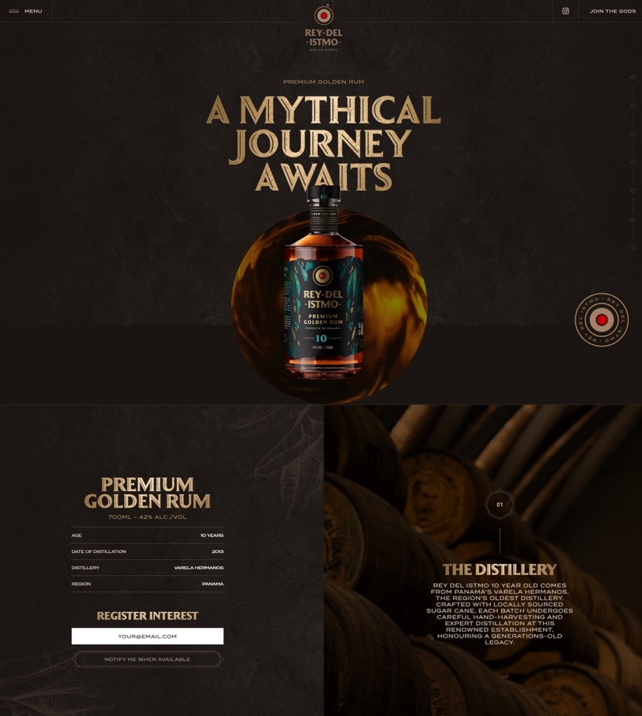 The website for Rey Del Istmo delivers a rich, immersive experience—bold visuals of the product, subtle animations as you scroll, and a refined dark palette that conveys craftsmanship and premium quality. Their product is a single-estate aged rum from Panama, rooted in heritage and the art of distillation, marrying luxury with authenticity. The design and narrative position the rum as not just a drink, but an experience steeped in story, place and elevated taste.