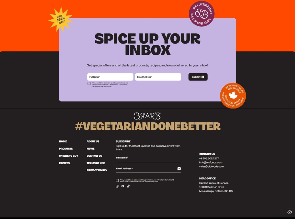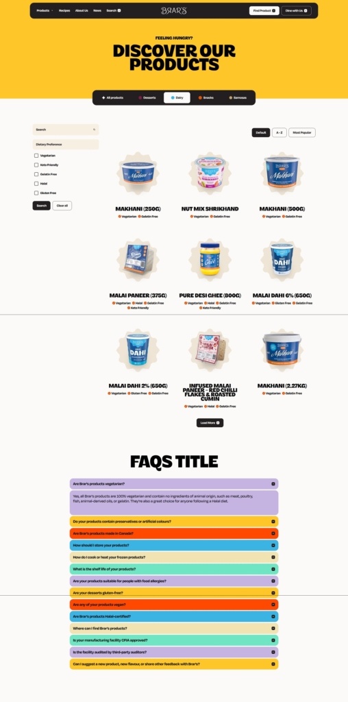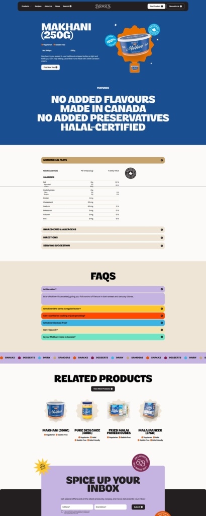 Brar’s website presents a warm, approachable design with rich visuals of family-style meals and Indian-vegetarian products, paired with clear, easy navigation. Their product lineup centers on authentic Indian vegetarian foods—such as paneer, ghee, snacks, sweets and frozen treats—highlighting heritage, quality and dietary-friendly labels like gluten-free or vegan. The site emphasizes community, tradition and transparency to frame their offerings as trusted, home-style choices for modern consumers.