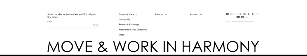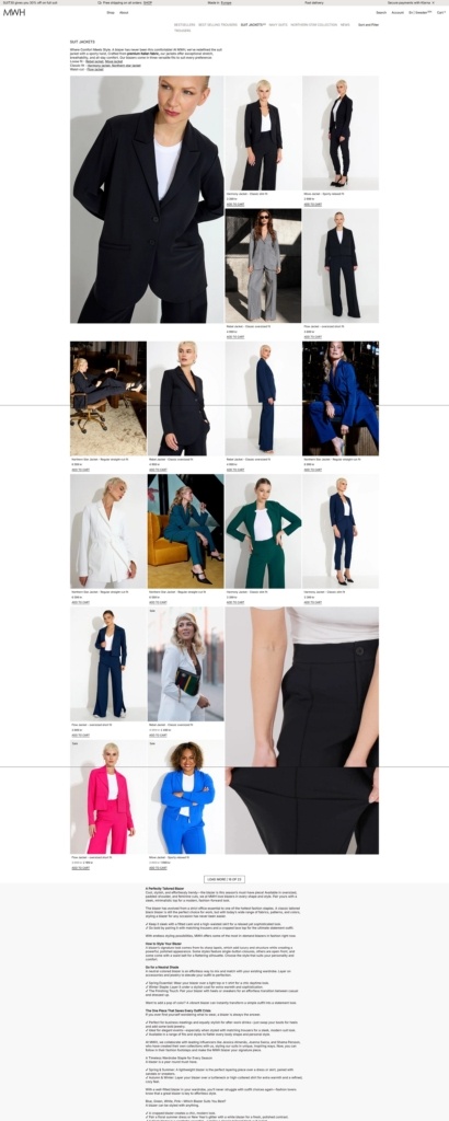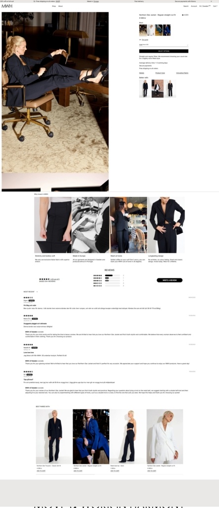 The website for MWH of Sweden combines Scandinavian minimalism with smart functionality — crisp white space, clean navigation, and bold hero visuals introduce the brand’s unique niche. Their product range focuses on tailored women’s businesswear that feels like activewear: suits, jackets, trousers, dresses designed with stretch fabrics and European craftsmanship.