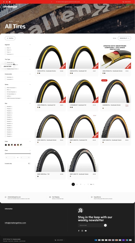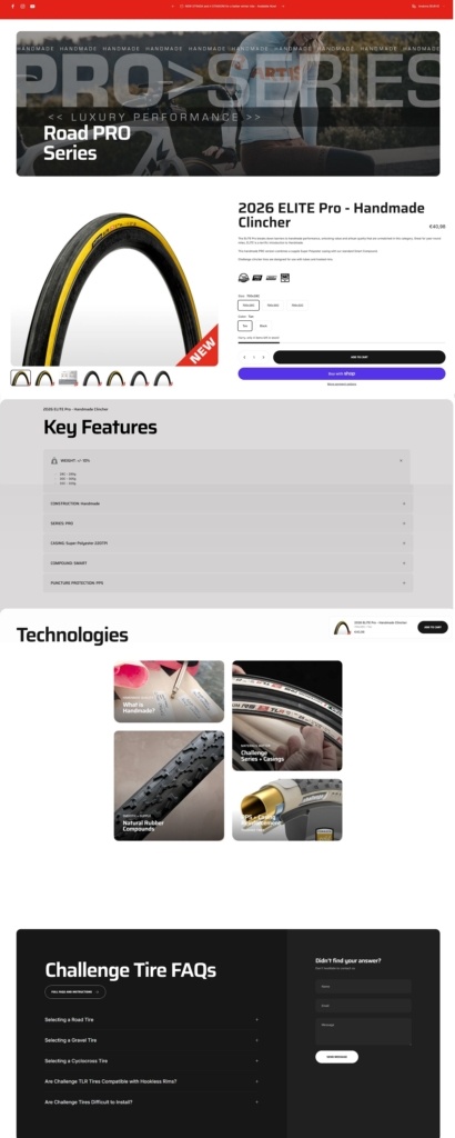 Challenge Tires’ website uses a clean, functional e-commerce design with intuitive navigation, clear product categories, and bold tire imagery that makes browsing easy. Their product range focuses on high-performance bicycle tires and inner tubes engineered for road, gravel, and mountain riding.