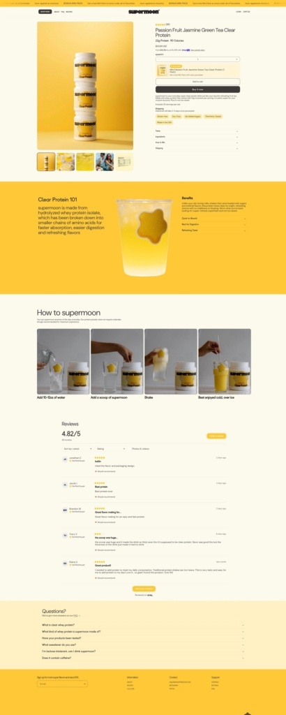 Supermoon offers a range of “clear-whey” protein drinks with 22 g protein per serving — flavored like fruity Taiwanese teas, low-calorie, easy to digest and free from chalky texture. Their website uses a clean, modern e-commerce design: minimalist layout, clear navigation, strong product photography and concise copy that highlights product benefits (nutrition facts, taste, easy mixing).
