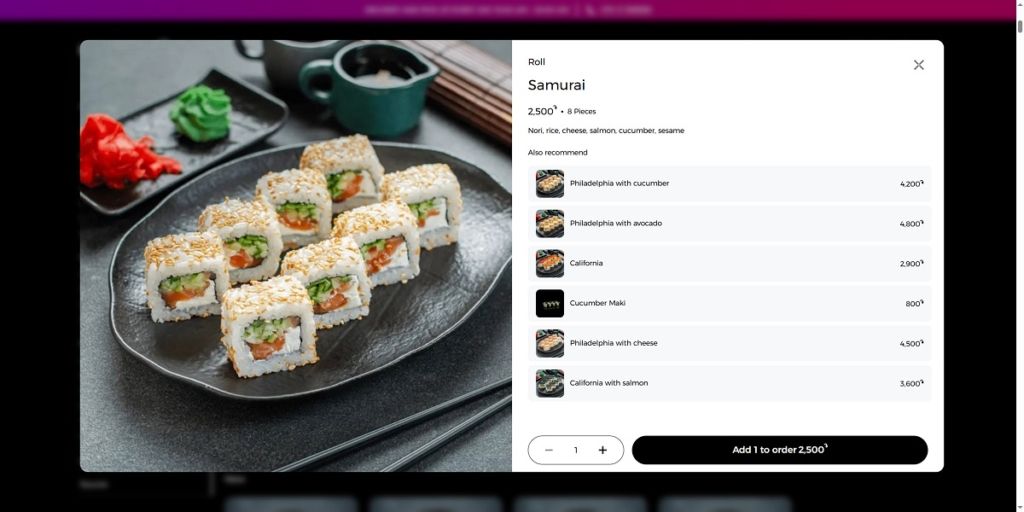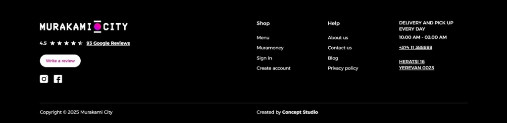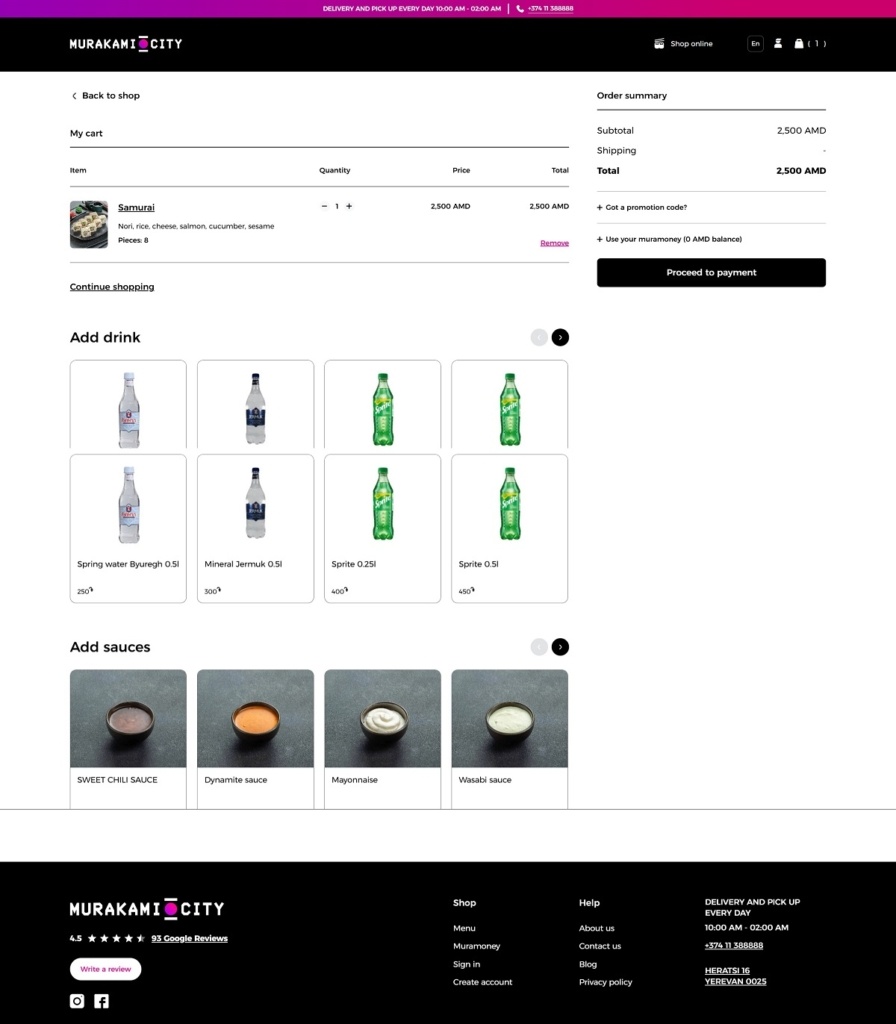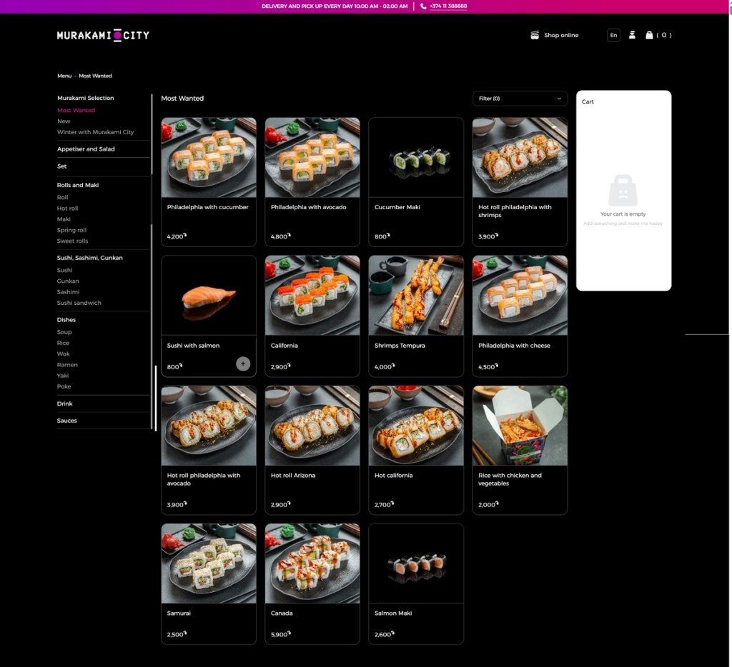 Murakami City operates an online platform for ordering Japanese food — primarily sushi and poke bowls — with delivery across Yerevan and nearby areas. Their website uses a clean, functional e-commerce design: a streamlined UI/UX, clear navigation, bold food photography and a smooth ordering flow that makes browsing the menu and placing orders intuitive and efficient.