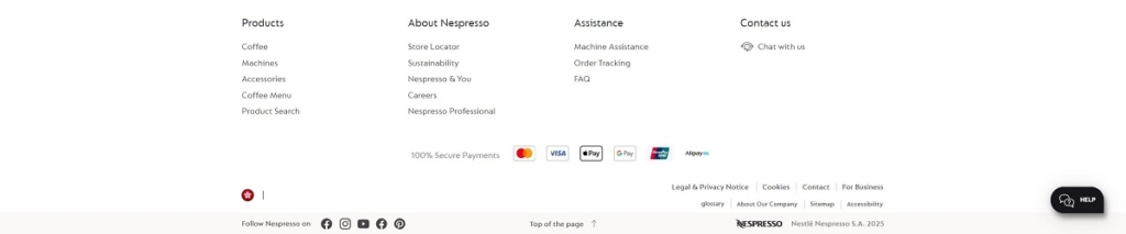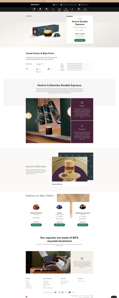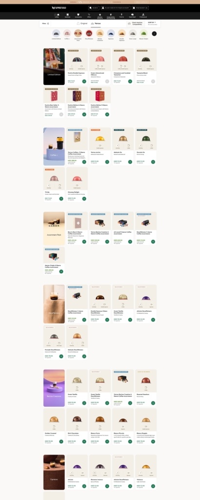 The website of Nespresso presents a clean, modern layout with intuitive navigation — clearly separating categories like Coffee, Machines, and Accessories — and uses sharp product photography and a minimalist design that reflects its premium positioning. Their product offering includes single-serve coffee capsules/pods, a range of espresso and coffee machines (Original and Vertuo lines), and related accessories for a complete at-home coffee experience.