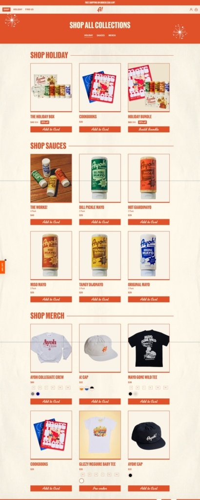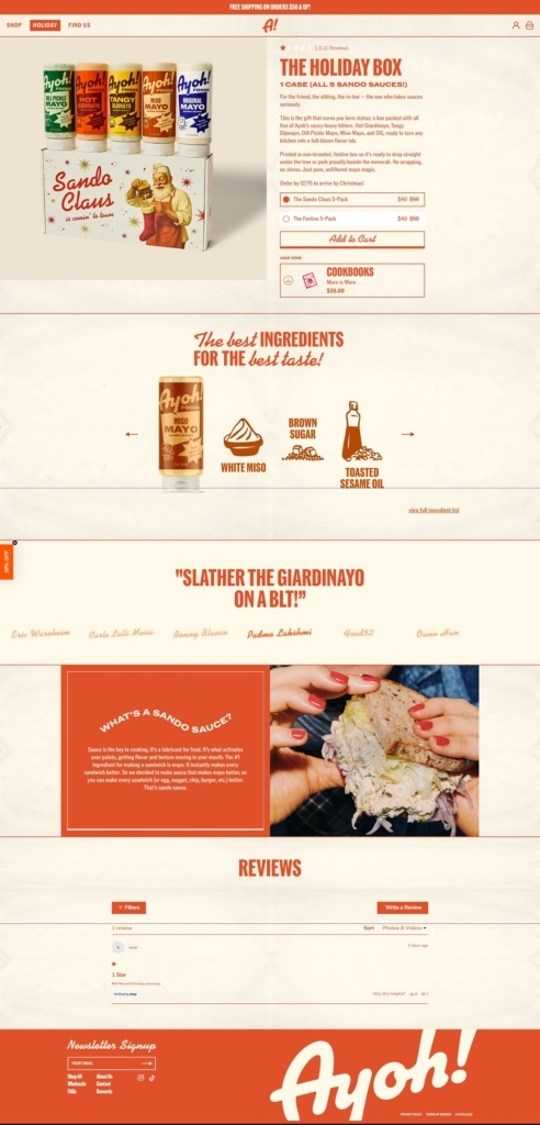 Ayoh! sells a line of “sando sauces” — mayo-based condiments infused with herbs, pickles, spices or chiles — meant to elevate sandwiches, fries, burgers, and snacks. The website uses a clean, structured layout with clear navigation and high-quality imagery that highlights both the products and their suggested food pairings. The overall design is straightforward and functional, making it easy for users to browse, explore flavours, and complete purchases.