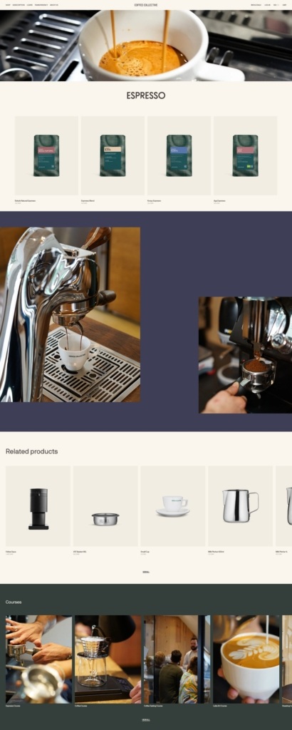 Coffee Collective’s website is clean, visually rich, and user-friendly: large, aromatic imagery paired with elegant typography and well-organized navigation. Their product range includes specialty coffees , brewing equipment, merch, and subscriptions of curated beans. They foreground transparency and sustainability in both design and content.