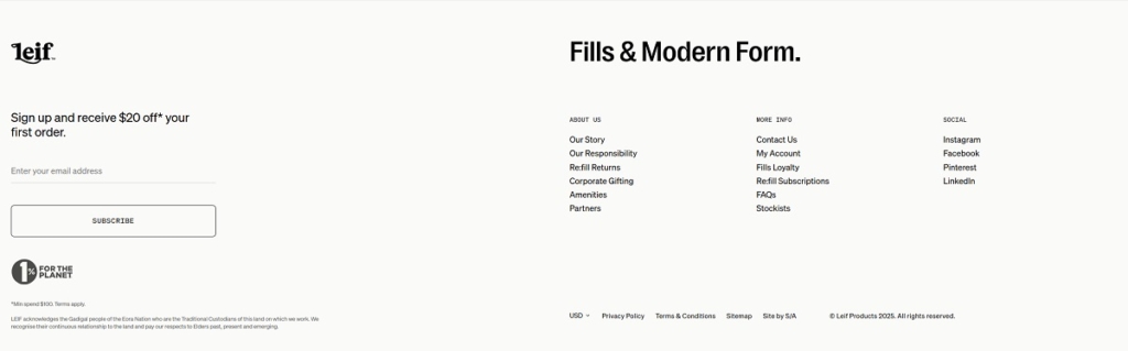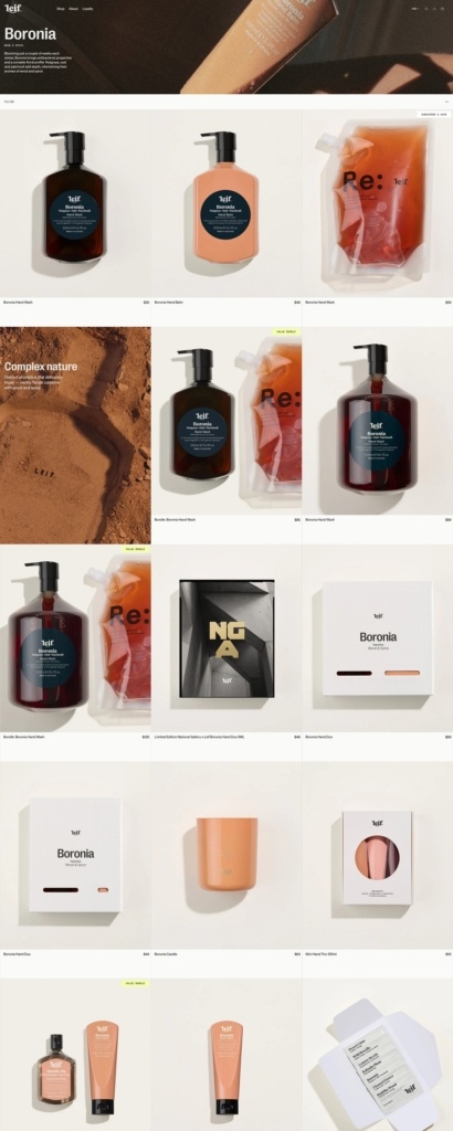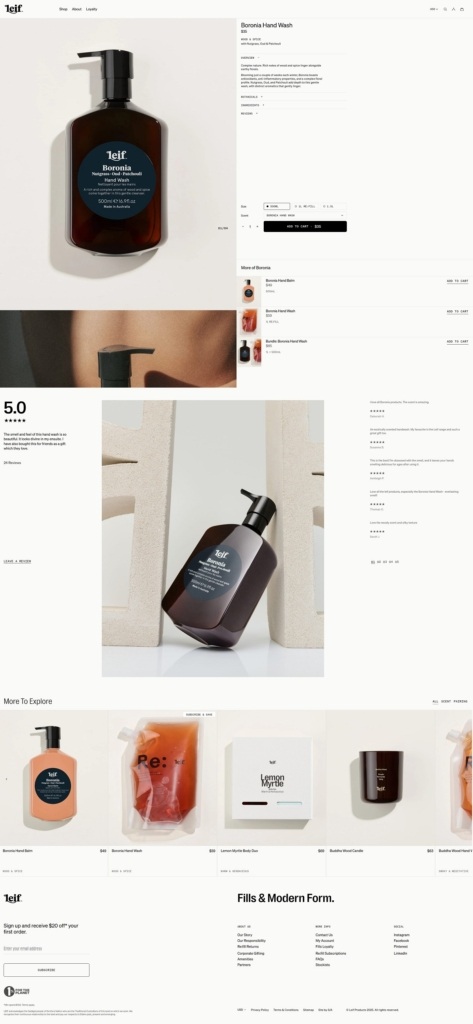 Leif’s site is clean, inviting, and thoughtfully organized, with bold imagery and soft, natural colour palettes that echo its brand ethos. They offer a curated range of skincare, haircare, body care, home products and eco-friendly refill options, all built around plant-based, cruelty-free formulations. The design emphasizes ease of shopping—clear collections, scent filters, bundles, and loyalty/refill programs—all framed in a sustainable, modern aesthetic.